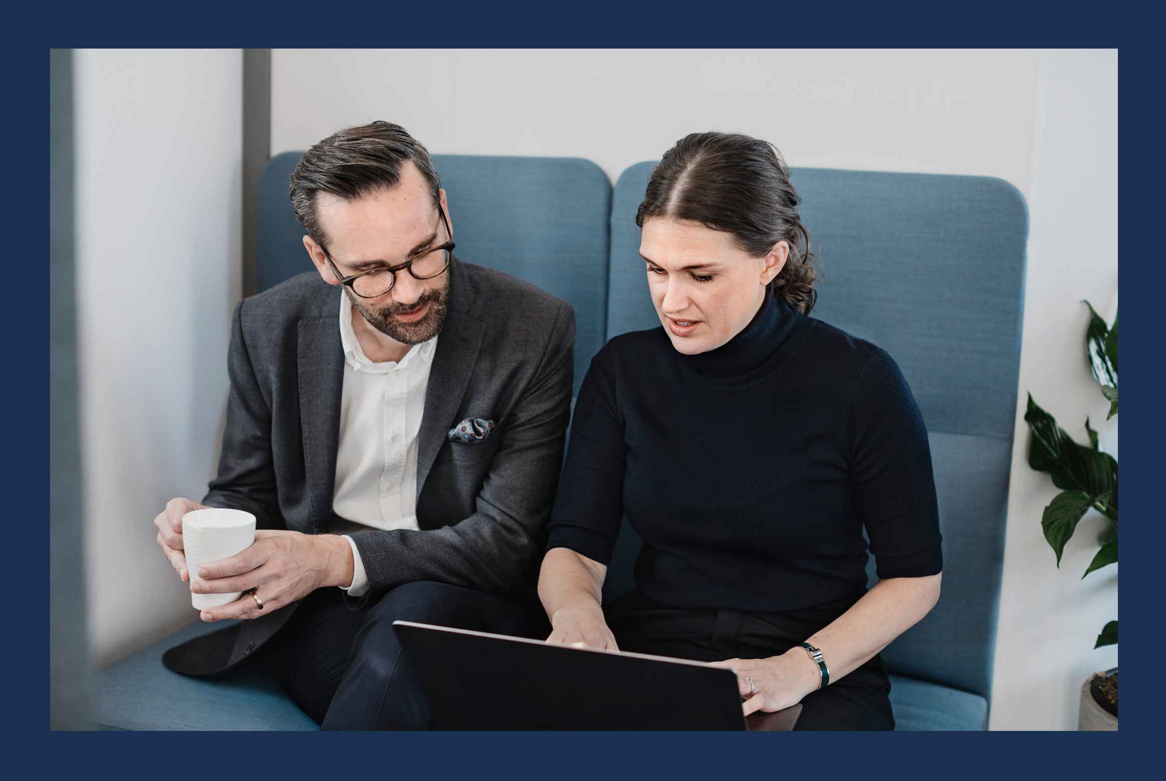 "alt": "A man and woman working on laptops.",