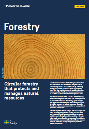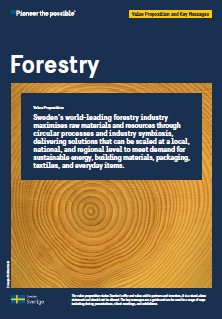 Photo: Melker Dahlstrand/imagebank.sweden.se About the forestry sector Sweden’s world-leading forestry industry maximises raw materials and resources through circular processes and industry symbiosis, delivering solutions that can be scaled at a local, national, and regional level to meet demand for sustainable energy, building materials, packaging, textiles, and everyday items. You can use this toolkit to attract trade and investment within the forestry sector.
