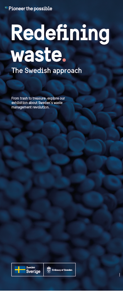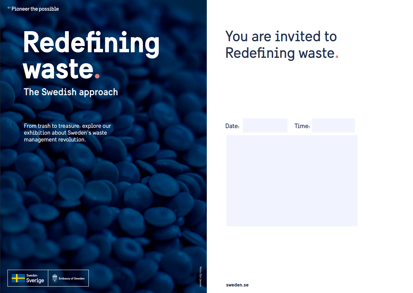'Redefining waste' exhibition and print material The exhibition is based on the booklet, but has only 600-900 characters per section, while the folder goes more in depth. The exhibition can raise interest among those who are not yet familiar with Swedish waste management. The booklet is meant for those who already have an interest and would like to know more. There is also a digital invitation template and a poster and rollup for printing with the toolkit's key visual.